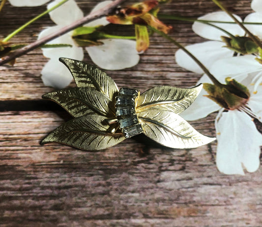 Gold Leaf and Rhinestone Vintage Retro Brooch Pin