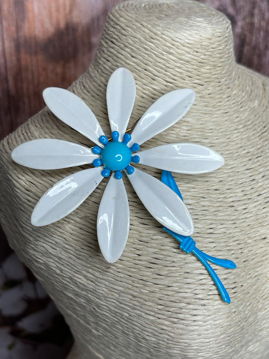 White Blue Enamel Flower Pin Vintage Floral Jewelry