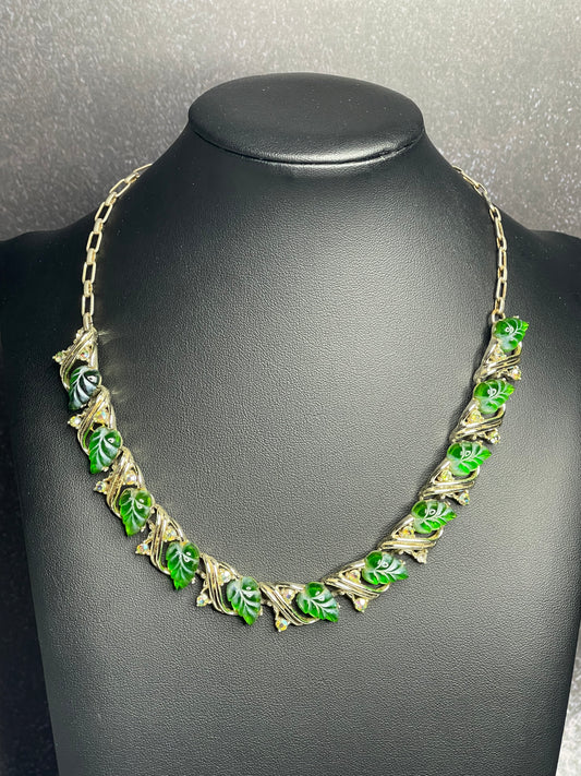 Vintage Green Jelly Carved Leaf and Rhinestone Gold Tone Necklace