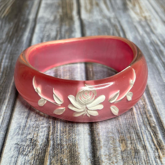 Vintage Reversed Carved Floral Pink Lucite Bangle