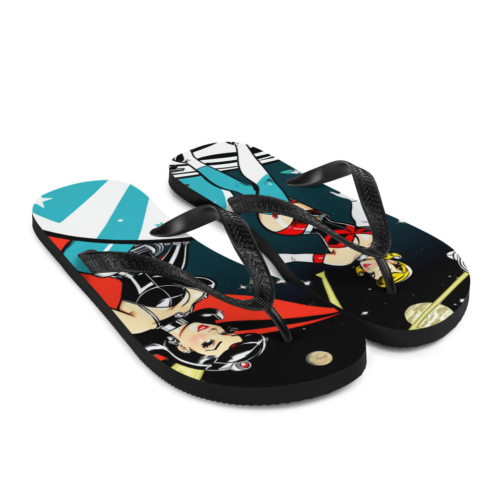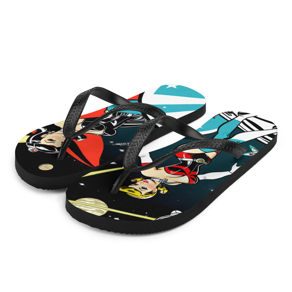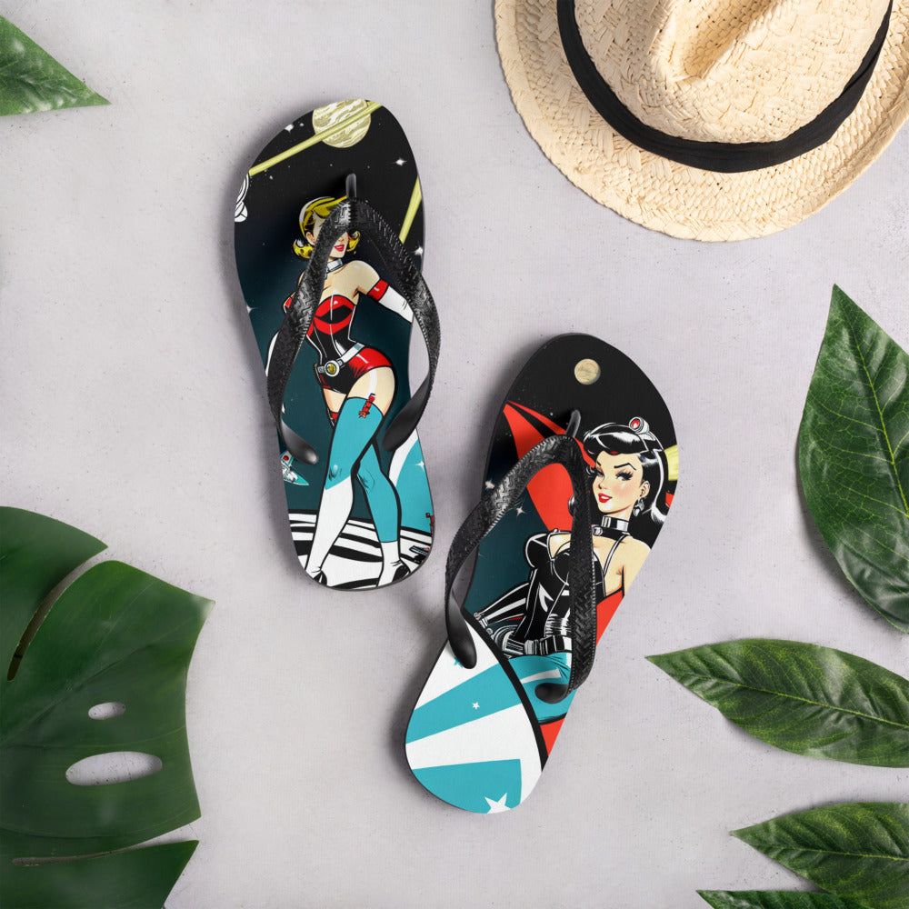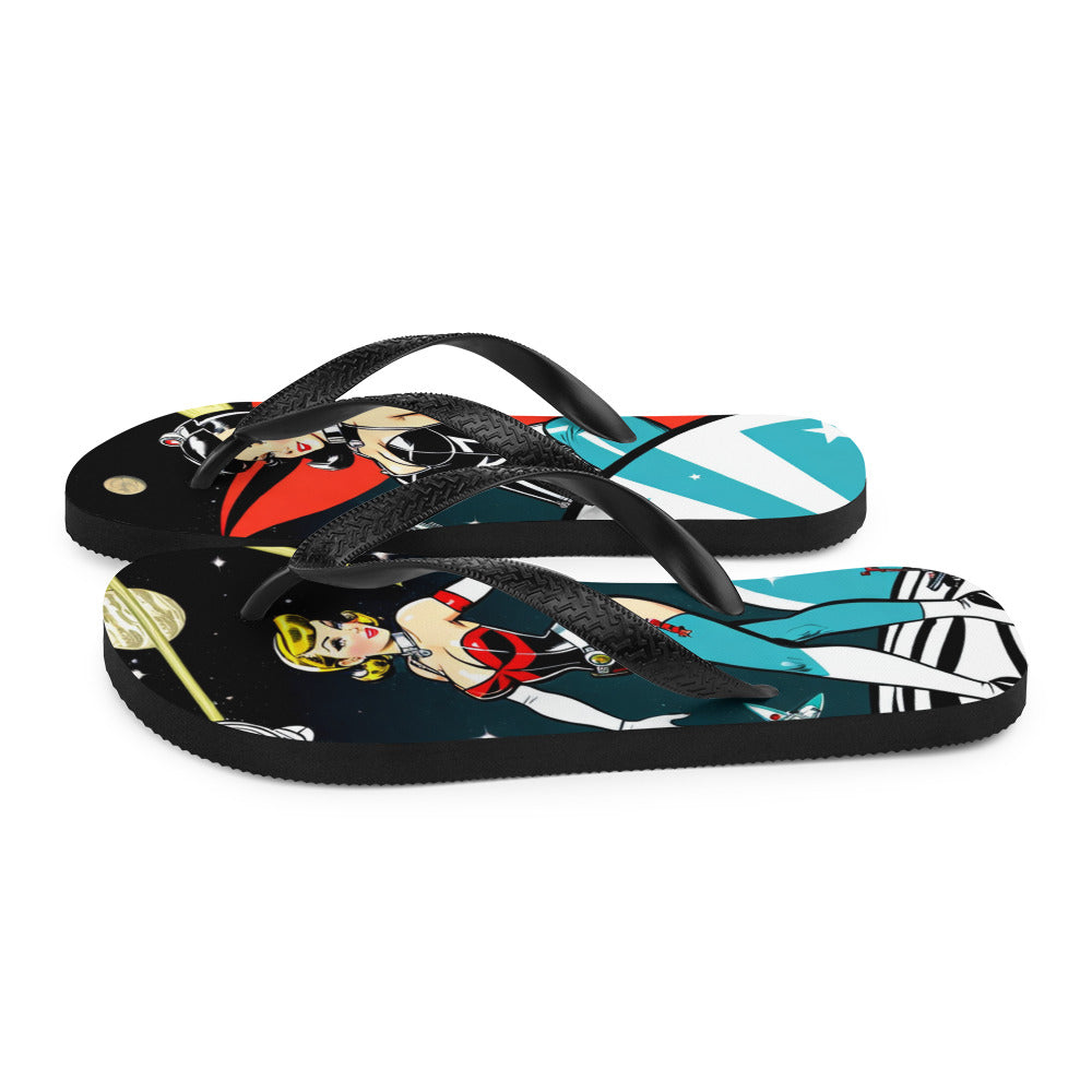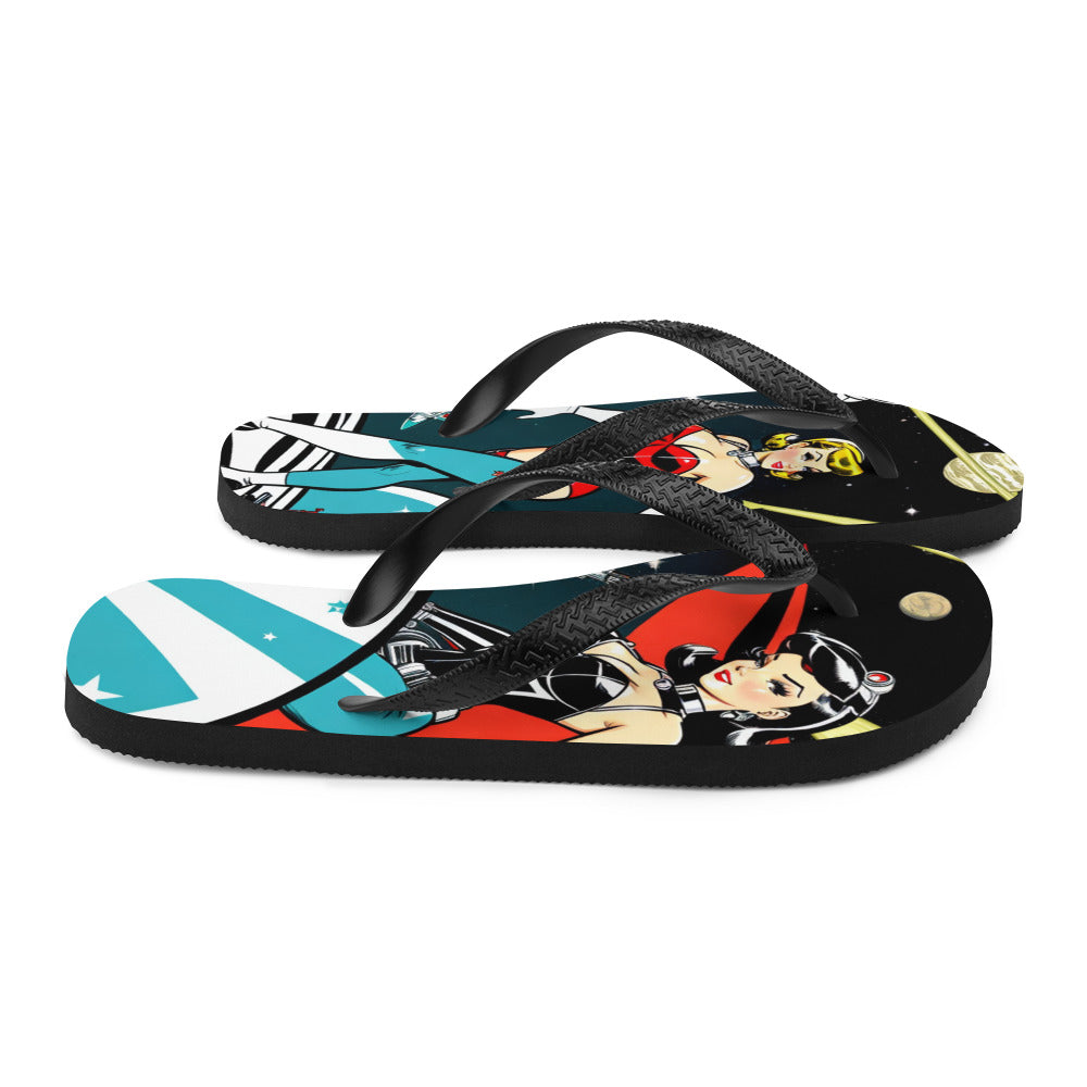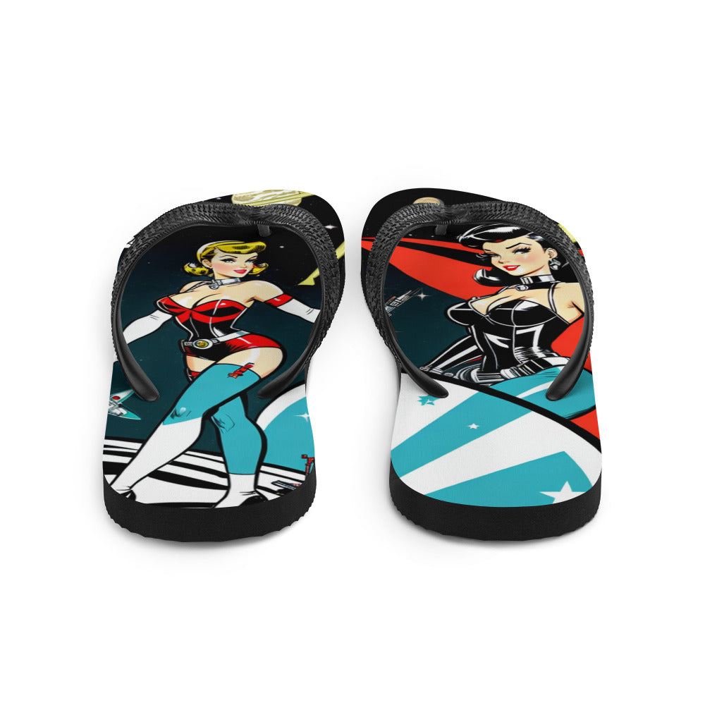 Prepare for an adventure and with a pair of colorful limited edition series one Atomic Pinup flip flops that are created during the robot apocalypse! The rubber sole is lined with a soft fabric to make sure you feel comfortable wherever your day takes you.