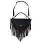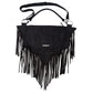 Kreepsville 666 bat wing fringe shoulder purse bag with detachable chain detail shoulder strap. Also includes a detachable and adjustable long shoulder strap to turn instantly into cross body purse bag. Made from vegan suede . Kreepsville 666 grey and black lining inside pockets with Kreepsville 666 logo badge on front and 9 inch fringe. Overall bat size approx 21in (53cm) w x 13.75 in (35 cm) h internal bag size 14 in (35.5cm) w x 8.5 in (21.5cm) h.