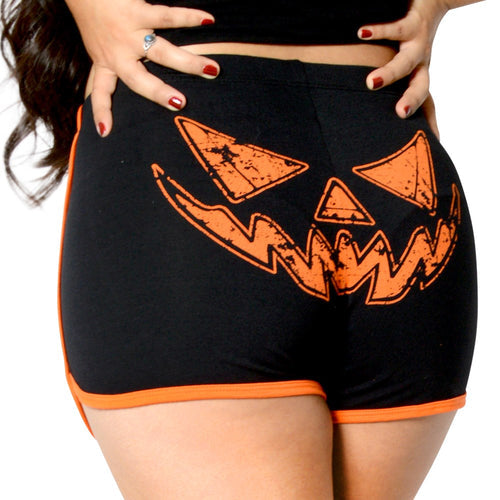 With the Pumpkin Trick Or Treat Womens Booty Shorts by Kreepsville everyday is Halloween! These shorts feature a gourd-geous pumpkin print on the front and a jack-o-lantern printed on the back with orange contrast piping on the edges. Crafted from 95% cotton and 5% spandex with elasticated waist these shorts provide a comfortable and flexible fit. Designed in California.