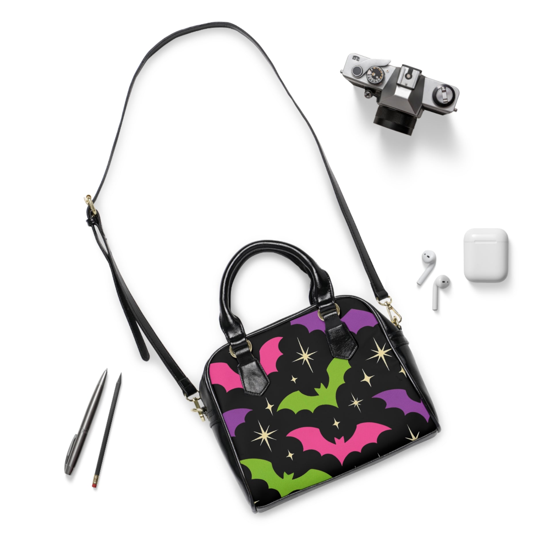 Ooky, and a little bit spooky — this shoulder handbag makes everyday day into a batty celebration. The double-sided print shows bats in magenta, lime, and purple with atomic star accents. Adjustable wear it as a handbag or a crossbody. Features, inside zip pocket and two slip pockets for phone and cards.