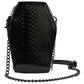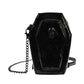 This convertible Coffin Mini Crossbody Skull Purse is the perfect small shoulder bag or wristlet. Styled in shiny croc faux vinyl and detailed with chrome skull. With the detachable shoulder strap it allows you to wear it as a cross body or over the shoulder or remove the strap and use the wristlet. With two zippered compartments - one large and one small – you can store all your essentials in style! The expandable 52” strap lets you wear it as a shoulder bag giving you versatility and convenience. Your new favourite go to gothic purse is perfect for any occasion. Approx 7.25” H (18.4cm) x 5” W (12.7cm) x 3" D (7.5CM). Designed in California made in China.