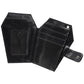 Get ready for a ride you will never forget with the officially licensed Elvira Macabre Mobile Coffin Wallet by Kreepsville! This gothic accessory features the Mistress of the Dark posed on her iconic Macabre Mobile on the front and a red steering wheel design printed on the back of a spooky coffin shaped wallet. Made with a soft and sturdy PU vinyl it's the perfect resting place for your cards and cash with 4 card spaces a clear I.D. holder and 2 inner compartments. The snap fastener and eyelet for a wallet chain ensure your creepy cash is safely secured. Sizes approx: 5.5" L (14cm) x 4.25" W (11cm); 8.25" (21cm) wide when fully opened.